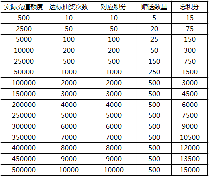 l 活动期间,每充值50元宝赠送一次抽奖机会。每抽奖1次,获得1个积分。
