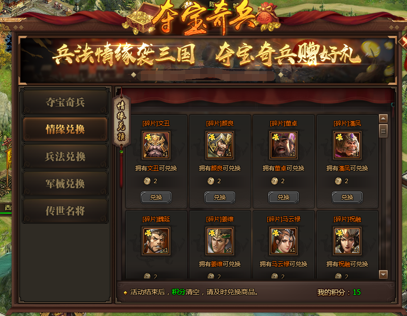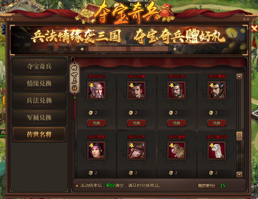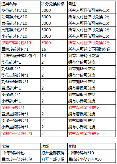 l 活动期间,开放传奇、无双武将碎片兑换;有武将即可兑换碎片,不限量,传奇武将碎片消耗1积分,无双武将碎片消耗2积分。