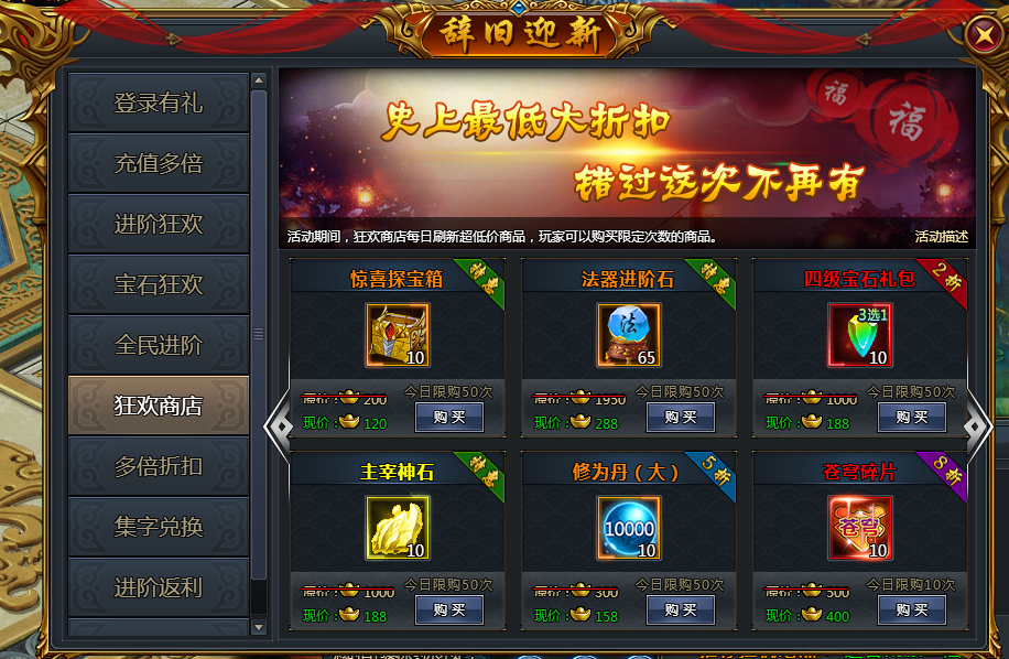 活动期间, 狂欢商店每日都会推出一批超低折扣价格的商品,史上最低价商品,欲购从速!