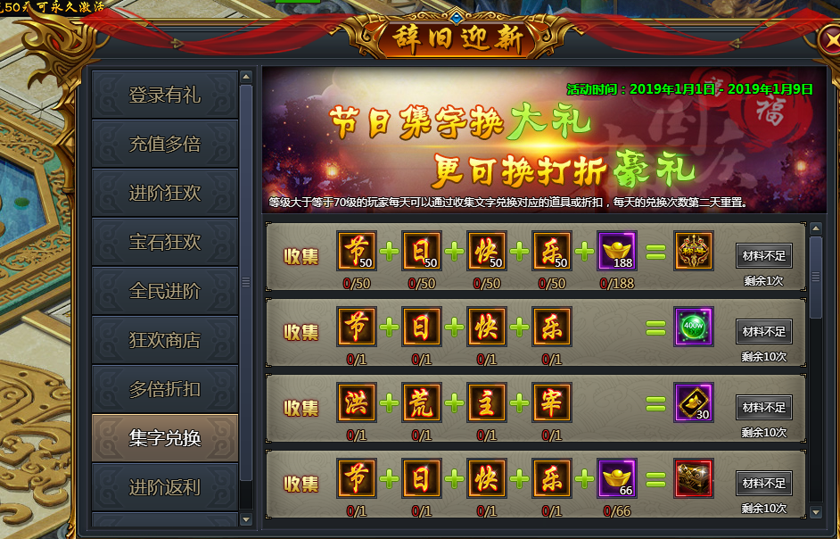活动期间,小怪和BOSS将会掉落“洪荒主宰节日快乐”八个字的道具,玩家可在活动界面消耗这些字来兑换丰厚大礼。