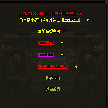 春节当天, 等级100级以上的玩家可免费领取节日登陆礼包, 前10名领取的可额外获得5元人民币, 全服限时限量, 先到先得。