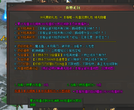 8、RMB路线:上线领取满回馈礼包领10%血切割,建议土城捐款领取叠加爆率属性。
